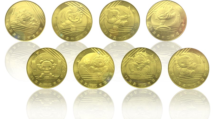 中國人民銀行于2006年9月20日發行第一組兩枚《第29奧林匹克運動會-游泳紀念幣》、《第29奧林匹克運動會-舉重紀念幣》;于2007年6月20日發行第二組三枚《第29奧林匹克運動會-乒乓球紀念幣》、《第29奧林匹克運動會-體操紀念幣》、《第29奧林匹克運動會-射箭紀念幣》;于2008年6月18日發行第三組三枚《第29奧林匹克運動會-足球紀念幣》、《第29奧林匹克運動會-擊劍紀念幣》、《第29奧林匹克運動會-現代五項紀念幣》。